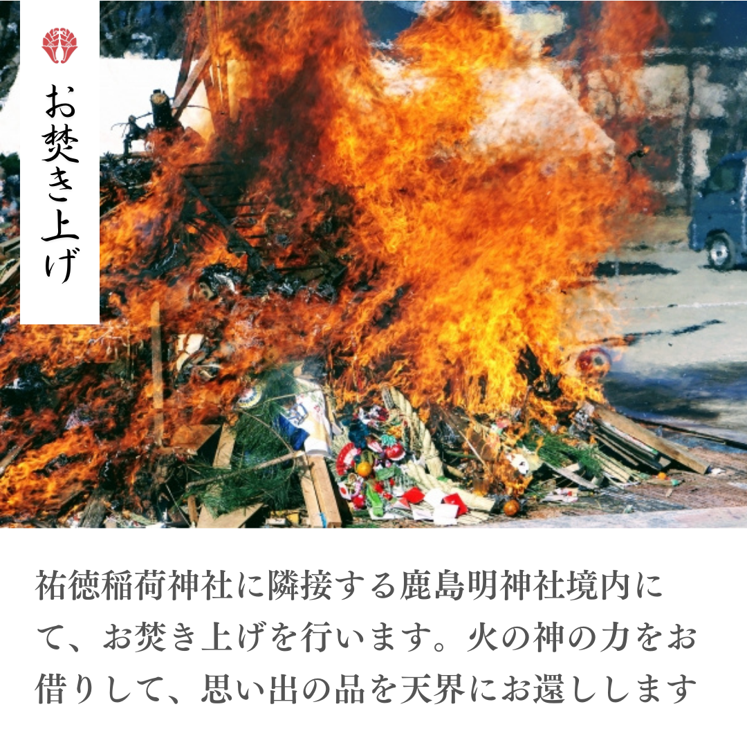 お送りいただいたお品は、祐徳稲荷神社(佐賀県鹿島市)境内にて神職が心を込めてお焚き上げいたします。