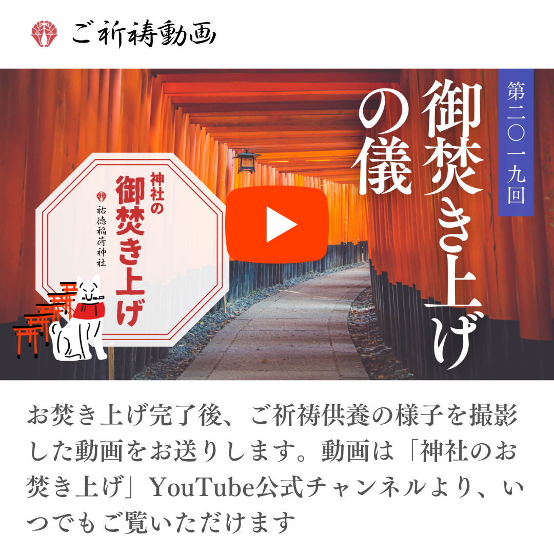 - 撮影オプションを申込みいただいた場合、お品の写真・動画を「神社のお焚き上げ」公式YouTubeに掲載いたします。撮影時のアングルや動画編集の都合上、お送りいただいたお品全てを撮影することはできませんのでご了承ください